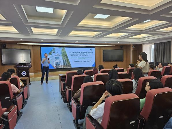 副院长张蕊副教授主持。马尔滕·范·德尔登教授在课程中介绍了墨西哥国宝级作家卡洛斯·富恩特斯的生平及其文学成就,并通过对四篇短文的细致分析,带领同学们认识了作家的写作手法和文学批评观点,使他们更深入地了解了作家,拓宽了阅读视角。