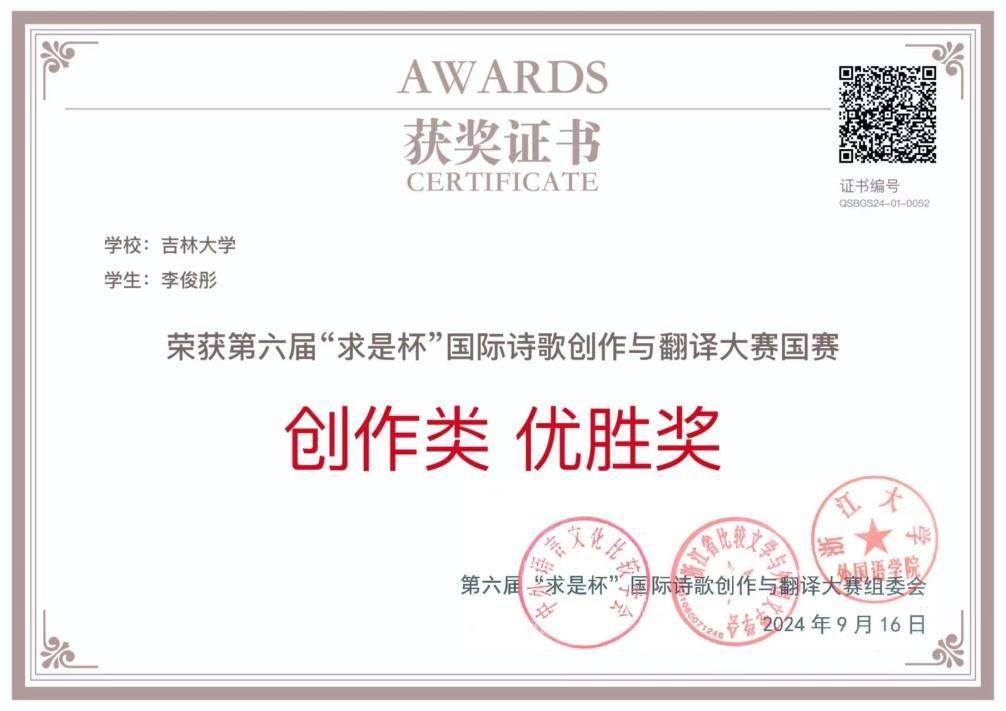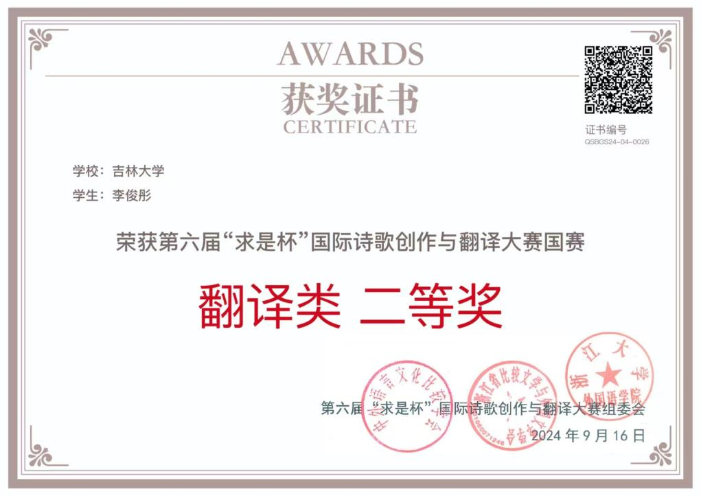 2022级俄文系学子李俊彤在第六届“求是杯”国际诗歌创作与翻译大赛国赛中,荣获俄语语种翻译类二等奖,同时获得诗歌创作类优胜奖。